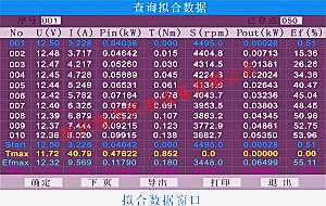 轉(zhuǎn)矩(Nm)、轉(zhuǎn)速(rpm)、輸出功率(Pout)、效率(%)加載量、三相包括A/B/C/E參數(shù);